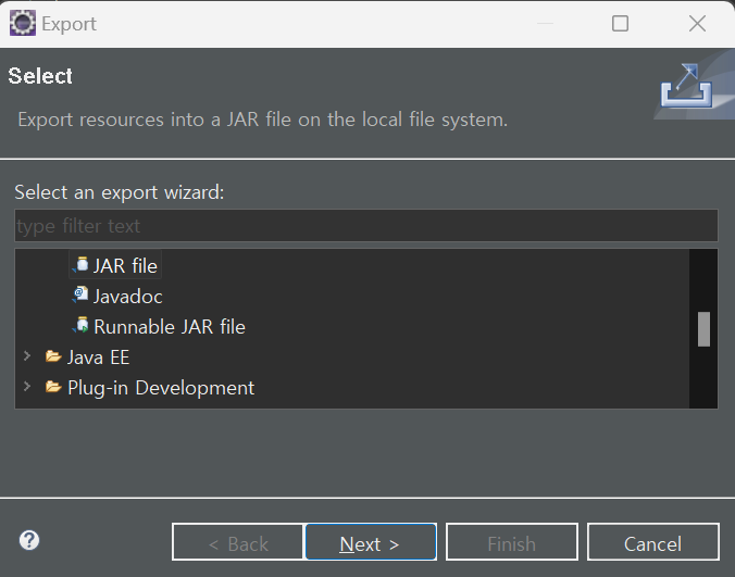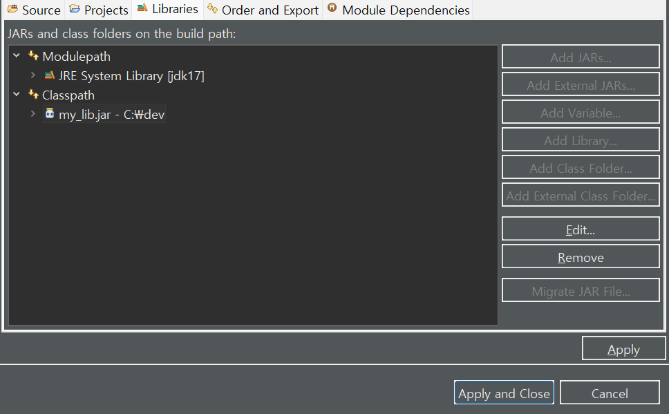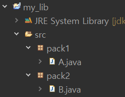 my_lib 오른쪽 버튼 -> [Export] 클릭 -> JAR file -> [Next] -> my_lib 체크 -> 폴더 및 이름 지정 -> [Finish]