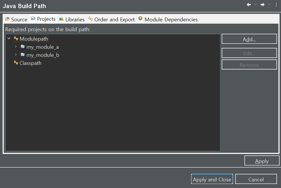 [my_application_2]오른쪽 버튼 -> [Build Path] -> [Configure Build Path] -> [Projects] -> Modulepath에 추가 -> [Apply]