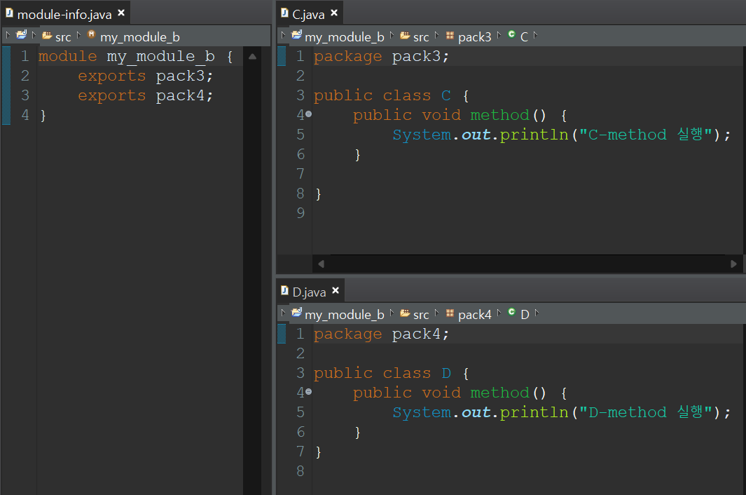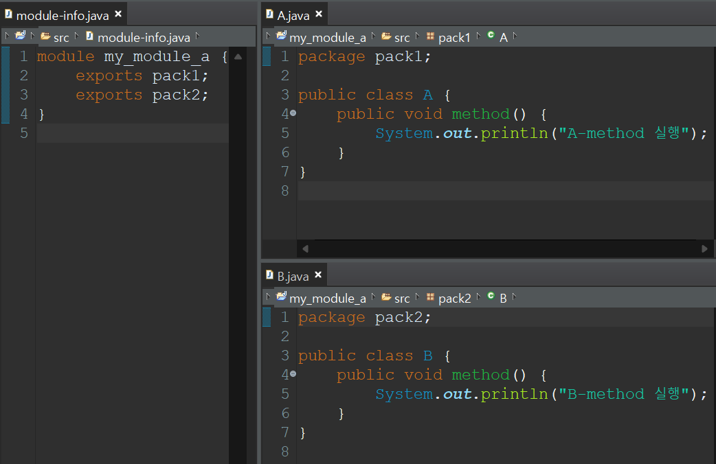 모듈은 모듈 기술자(module-info.java)에서 exprts 키워드를 사용해 내부 패키지 중 외부에서 사용할 패키지를 지정한다.