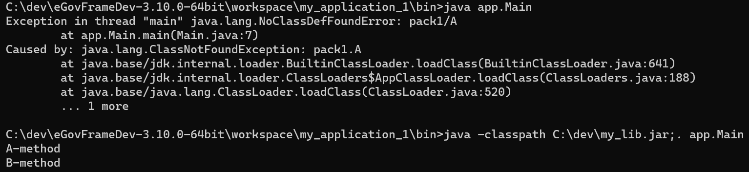 명령 프롬프트에서 현재 경로를 bin디렉토리로 이동하고 Main클래스를 실행하면 에러가 발생한다. my_lib.jar를 인식하지 못했기 때문이다.
